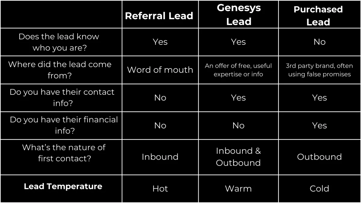 A purchased lead typically doesn’t know who you are or what you’re capable of. When you reach out to them, you must first build trust and establish a relationship before you can even discuss financial details.